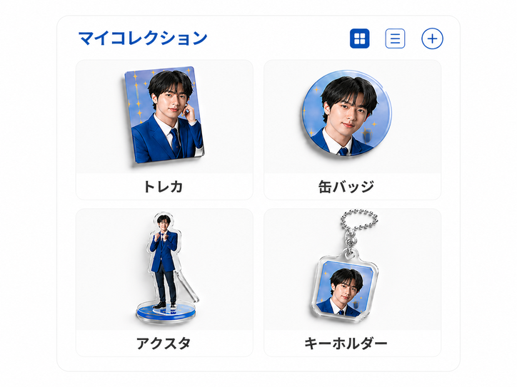トレカ・缶バッジ・アクスタなど、手持ちのグッズを写真付きでまとめて登録。